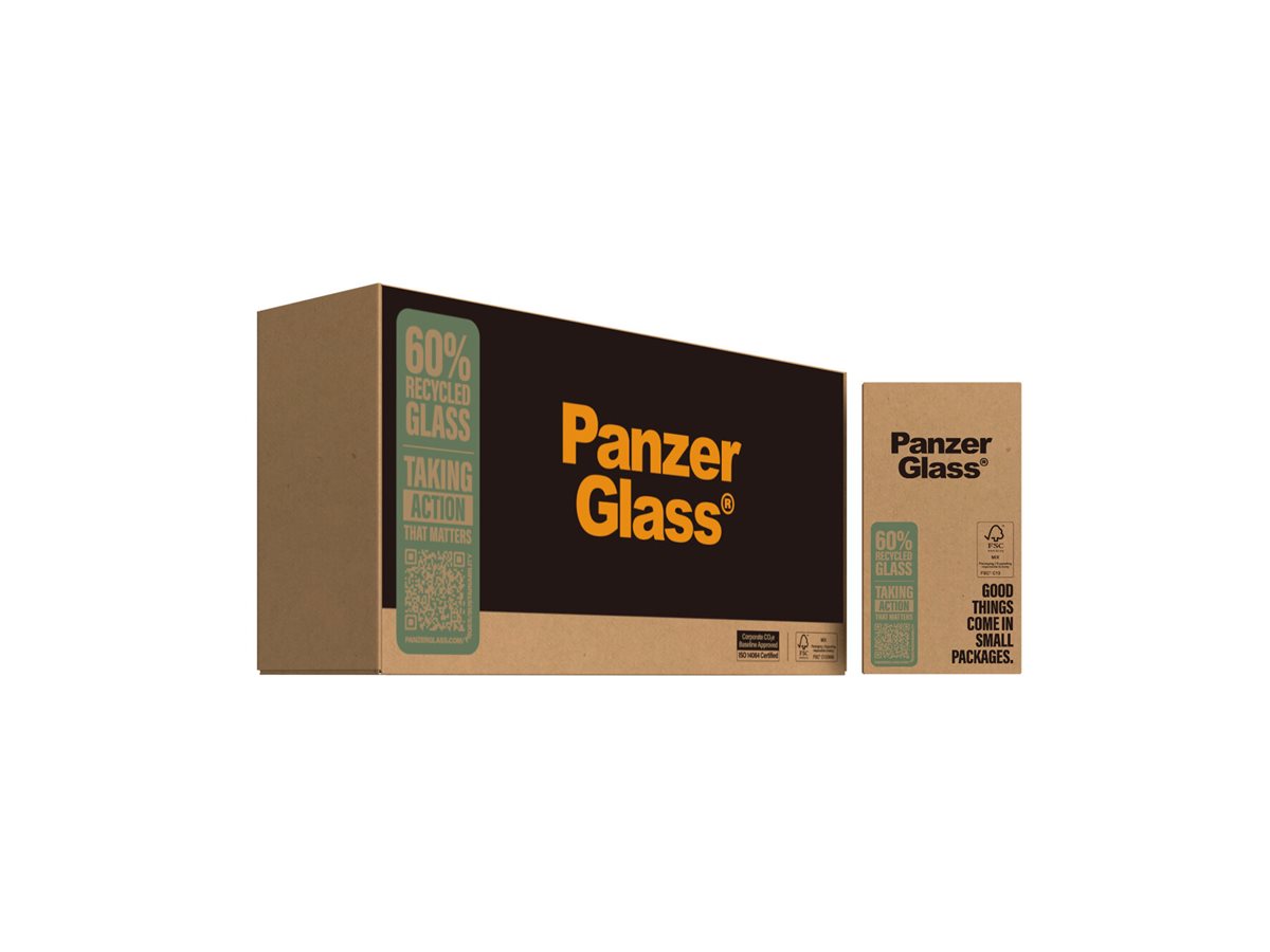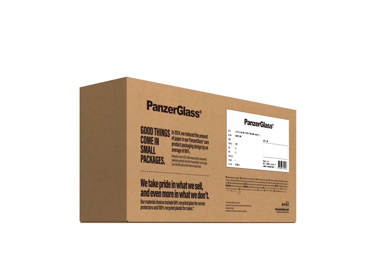 Mere genanvendelse. Bedre beskyttelse. Længere telefonlevetid. Med den her skærmbeskytter fra PanzerGlass får du det hele. Skærmbeskytteren er lavet af 60 % genanvendt materiale, er 3 x mere ridsefast end tidligere modeller og holder både ridser, revner, slag og stød på sikker afstand af din skærm – vel at mærke uden at det går ud over telefonens funktionalitet og design. Glasset har endda en smudsafvisende belægning, der reducerer fedtfingre og snavs på skærmen. Skærmbeskytteren kan forlænge levetiden på din telefon, så du måske en dag kan give den videre til en anden, som vil elske den lige så højt som dig. Det er ren telefonkærlighed. For jo længere vi kan holde vores enheder i live, jo længere kan vi vente med at producere nye enheder, som belaster miljøet. Og nu vi taler om miljøet, bruger den her skærmbeskyttelse 33 %* mindre papiremballage end tidligere modeller og leveres i en genanvendelig FSC -mærket æske.Følg trin-for-trin-guiden eller scan QR-koden til sådan-installerer-du-videoen, der gør installationen så legende let. Når først skærmbeskytteren sidder på telefonen, er det slut med at frygte synet af din skærm med kurs mod asfalten. Det kommer muligvis aldrig til at ske, men hvis det gør, vil du fortryde, at du ikke klikkede "Tilføj til kurv".Skærmbeskytteren har størrelsen "Ultra-Wide Fit". Det betyder, at den dækker fronten af din telefon, samtidig med at den giver dig en krystalklar skærmoplevelse og efterlader lidt plads langs kanterne til et cover. Vil du give din telefon 360-graders beskyttelse, kan du kombinere skærmbeskyttelsen med et PanzerGlass cover og en PanzerGlass PicturePerfect eller Hoops kameralinsebeskytter.*Beregnet af tredjepartslaboratorium ved at sammenligne vægten af den nye papiremballage introduceret i 2023 med vægten af den tidligere papiremballage introduceret i 2022 (CPRTC, rapportnummer ZSA20231301-0016).