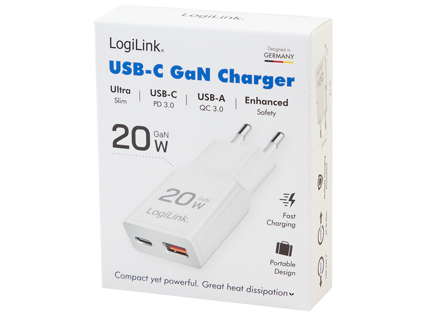 Logilink adapter GaN 20Watt 1xUSB-C 1xUSB-A Hvid