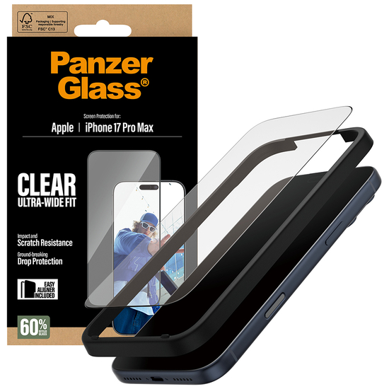 60 % genanvendt glas. 100 % styrke. 100 % original. Med den her skærmbeskytter fra PanzerGlass får du det hele. Det hærdede glas fungerer som en diskret airbag, der holder både ridser, revner, slag og stød på sikker afstand, så du kan gå gennem livet med ro i maven og en skærm, der bliver ved med at se ud som ny. Skærmbeskytteren er lavet af næsten to tredjedele genanvendt glas og har endda en smudsafvisende belægning, der reducerer fedtfingre og snavs. Den medfølgende EasyAligner lavet af 100 % genanvendt plast gør installationen så legende let, at de fleste kan klare den i første forsøg. Og ellers følger du bare trin-for-trin-guiden eller scanner QR-koden til sådan-installerer-du-videoen. Når først skærmbeskyttelsen sidder på telefonen, er det slut med at frygte synet af din skærm med kurs mod asfalten. Det kommer muligvis aldrig til at ske, men hvis det gør, vil du fortryde, at du ikke klikkede "Tilføj til kurv". Skærmbeskytteren kan forlænge levetiden på din telefon, så du en dag kan give den videre til en anden, som vil elske den lige så højt som dig. Det er ren telefonkærlighed – og én måde at bidrage til en mere bæredygtig fremtid på! En anden er at bruge mindre emballage: I 2024 reducerede vi mængden af papir i vores emballager med 66 %*, ligesom vi naturligvis fortsat leverer alle produkter i genanvendeligeFSC -mærkede æsker. Skærmbeskytteren har størrelsen "Ultra-Wide Fit". Det betyder, at den dækker fronten af din telefon, samtidig med at den giver dig en fuldendt skærmoplevelse og efterlader lidt plads langs kanterne til et beskyttende cover fra PanzerGlass . Det kunne fx være et designercover fra CARE by PanzerGlass . Og vil du passe ekstra godt på din telefon, kan du nemt kombinere skærmbeskytteren og coveret med en PanzerGlass PicturePerfect eller Hoops kameralinsebeskytter. *Gennemsnitlig reduktion fra 2022 til 2024 beregnet ved at sammenligne udvalgte PanzerGlass kerneprodukter.