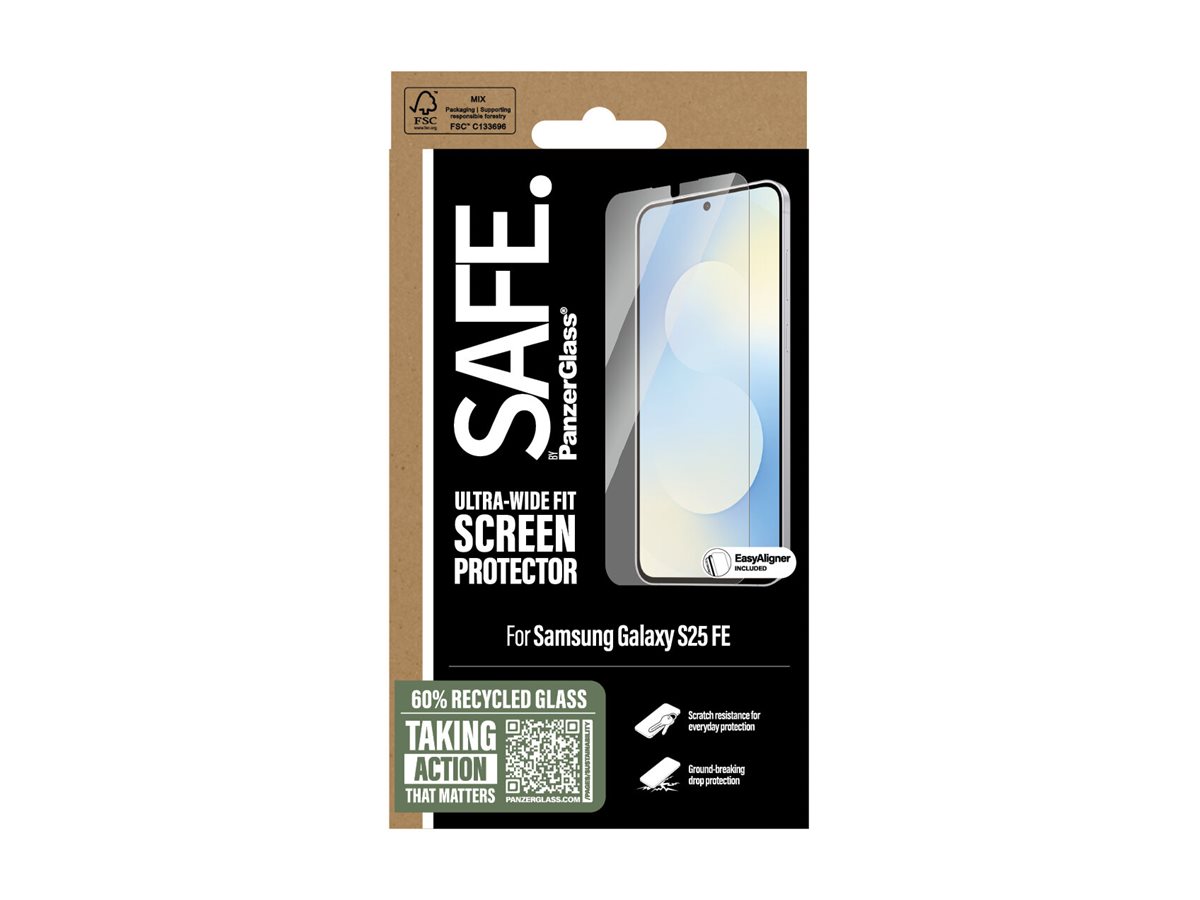 Skærmbeskytteren fra SAFE. by PanzerGlass er for real. Designet til dig, dine venner og din kæreste. Skabt til at modstå scratches og drops, når I slentrer gennem byen og danser hele natten. Og lavet af 60 % genanvendt glas, så vi sammen kan tage endnu et skridt mod en bedre fremtid. Glasset fungerer som en diskret airbag, der beskytter din skærm, uden at det går ud over telefonens funktionalitet og lækre design.Når du vælger SAFE., gør du det ikke kun for din egen skyld, men også for alle dem, der kan få glæde af din telefon efter dig! Ved at passe godt på din elskede mobil kan du nemlig give den et andet, tredje og nogle gange fjerde liv hos en anden, som vil elske den lige så højt som dig. Det er ren telefonkærlighed – og én måde at bidrage til mere bæredygtig fremtid på! Vi leverer naturligvis fortsat alle produkter i genanvendelige FSC -mærkede æsker.SAFE. er noget, man føler sig. Det skal være nemt, ligetil og for alle. Uden lange manualer og langhårede instruktioner. Med EasyAligneren bliver installationen så legende let (seriøst!), at de fleste kan klare den i første forsøg. Og får du brug for en ekstra hånd, tjekker du bare trin-for-trin-guiden eller QR-koden til videoen. Og husk: Så snart skærmbeskytteren sidder på din mobil, er det slut med at frygte slo-mo-synet af din skærm, der nosediver mod asfalten. Det kommer muligvis aldrig til at ske, men hvis det gør, vil du fortryde, at du ikke klikkede "Tilføj til kurv".Selv den bedste skærmbeskyttelse er nul værd, hvis den går ud over skærmoplevelsen! I hvert fald hvis du spørger os. Derfor har den her skærmbeskytter størrelsen "Ultra-Wide Fit"! Det betyder, at den beskytter fronten af din telefon, samtidig med at den giver dig en fuldendt skærmoplevelse og efterlader lidt plads langs kanterne til et cover. Vil du være ekstra SAFE., kan du altså nemt kombinere skærmbeskyttelsen med et cover og en kameralinsebeskytter fra SAFE. by PanzerGlas .Keep your phone SAFE.