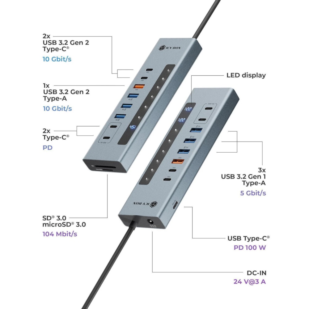 RaidSonic ICY BOX - 11-in-1 - Indgang: USB-A/USB-C - PD 45W - Udgange: USB-A, USB-C, SD, MicroSD - USB 3.2 Gen2 (10 Gbps)