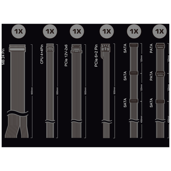 | Output-stikforbindelser | 1 x strøm 24 pin ATX | 1 x strøm 8 pin EPS12 V med aftagelig 4 pin ATX12V sektion | 2 x 8 pin PCI Express-strøm med aftagelig 2 pin sektion | 4 x 15 pin Serial ATA strøm | 2 x 4-PIN intern strøm | 1 x 12VHPWR |