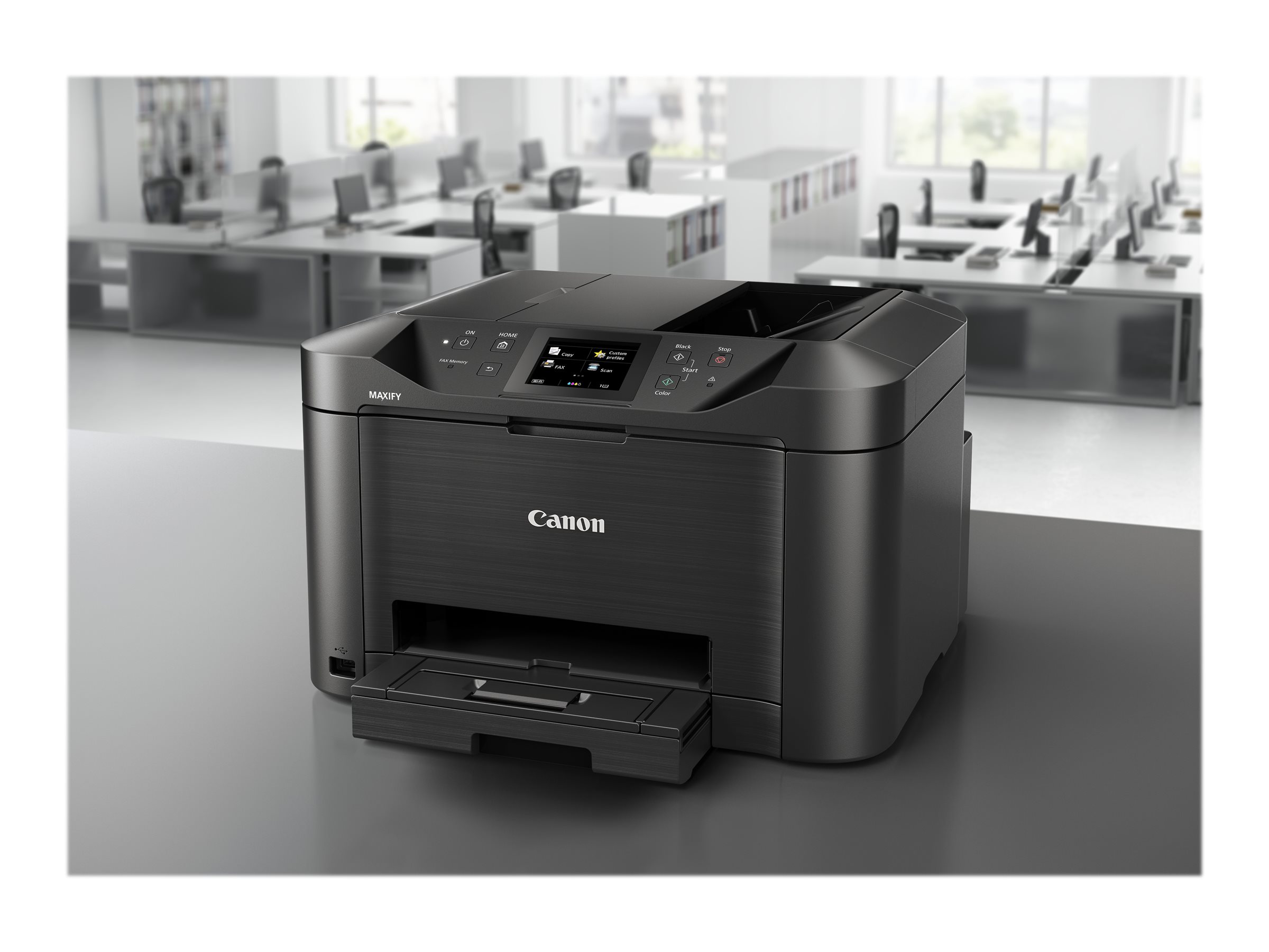 Print, kopiering, scanning og fax er enkelt med Canon MAXIFY MB5150-seriens store 8,8 cm (3,5") TFT-farvetouchscreen og forbedret brugerinterface. Ud over den høje kapacitet 250-arks fremfører og 50-arks automatisk dokumentfremfører gør dobbeltsidet print og understøttelse af et bredt udvalg af papirformater og -typer fra almindeligt A4-papir til etiketter, kuverter, fotopapir og sågar tosidet id-kortkopiering, det let at arbejde med almindelige printopgaver på kontoret.