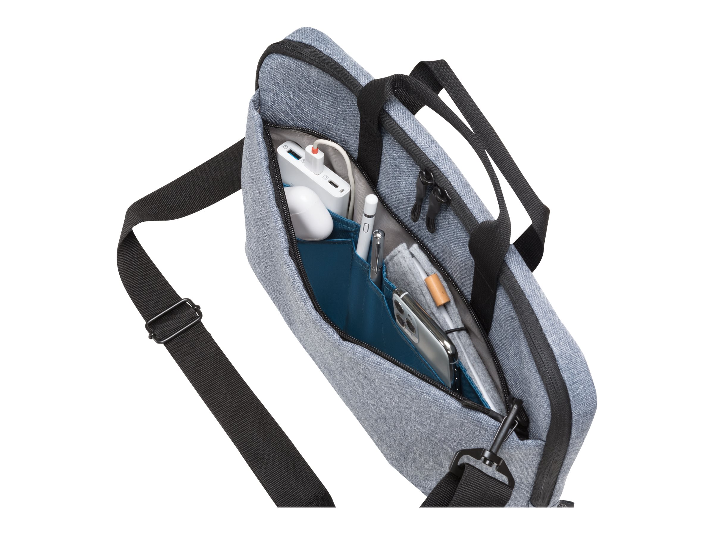Eco slim case Motion er en let og slank taske til bærbare computere. Enheder mellem 10" og 11,6" er godt beskyttet i det polstrede notebook-rum. Stiklommen giver pålidelig beskyttelse til tablets op til 10,9". Tasken er behagelig at bære takket være det polstrede bærehåndtag og den justerbare skulderrem. Det ekstra rum på bagsiden er især praktisk til nem opbevaring af dokumenter. Din smartphone eller andre mindre ting som kabler, kuglepenne eller opladere kan opbevares i den praktiske forlomme, så de altid er lige ved hånden. Tasken er lavet af vandafvisende materiale for at beskytte indholdet selv på regnfulde dage. Eco slim case Motion er derfor perfekt til dig, der altid er på farten og gerne vil støtte genanvendelsen af PET-flasker med en miljøvenlig taske.