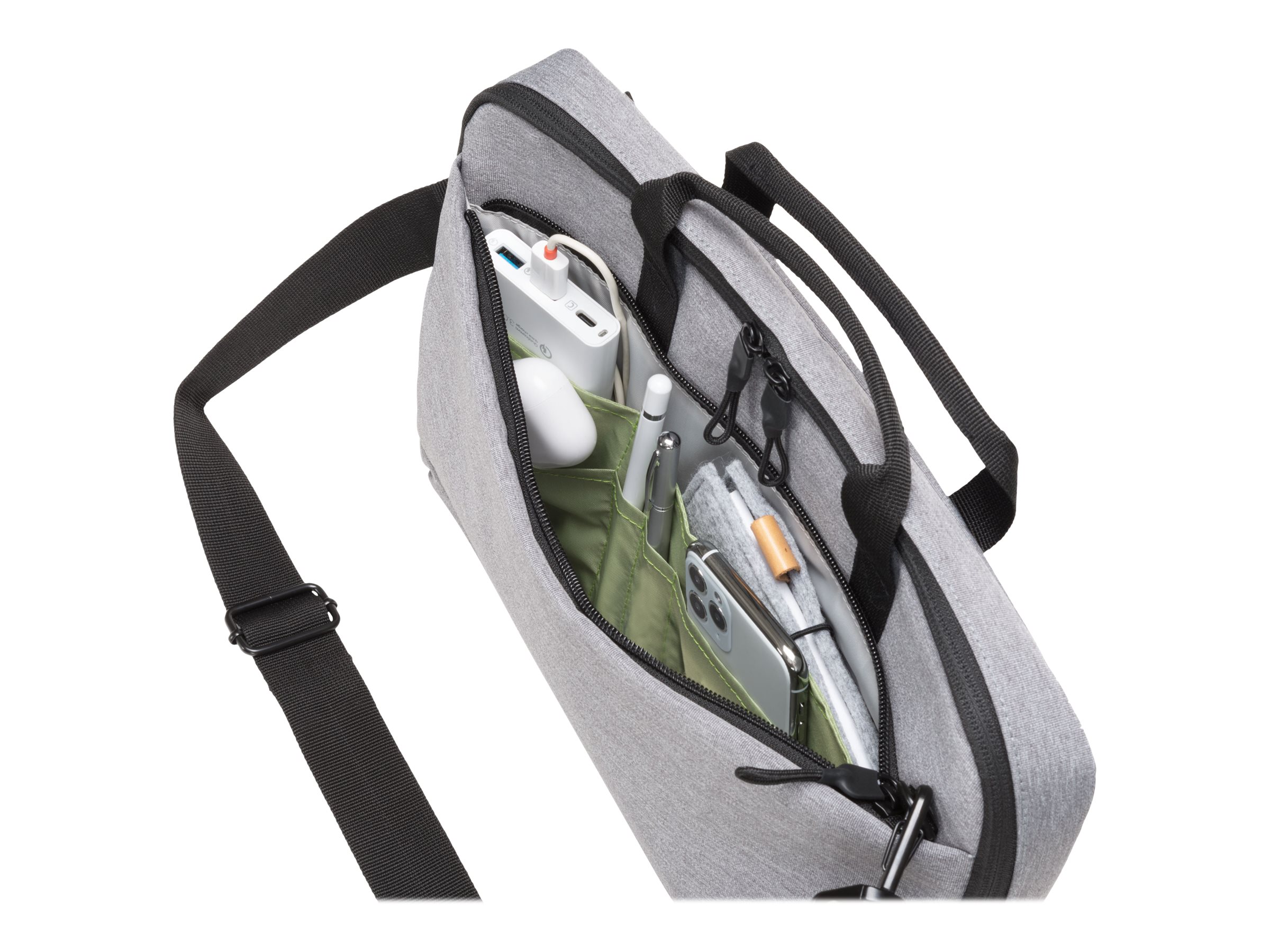 Eco slim case Motion er en let og slank taske til bærbare computere. Enheder mellem 10" og 11,6" er godt beskyttet i det polstrede notebook-rum. Stiklommen giver pålidelig beskyttelse til tablets op til 10,9". Tasken er behagelig at bære takket være det polstrede bærehåndtag og den justerbare skulderrem. Det ekstra rum på bagsiden er især praktisk til nem opbevaring af dokumenter. Din smartphone eller andre mindre ting som kabler, kuglepenne eller opladere kan opbevares i den praktiske forlomme, så de altid er lige ved hånden. Tasken er lavet af vandafvisende materiale for at beskytte indholdet selv på regnfulde dage. Eco slim case Motion er derfor perfekt til dig, der altid er på farten og gerne vil støtte genanvendelsen af PET-flasker med en miljøvenlig taske.