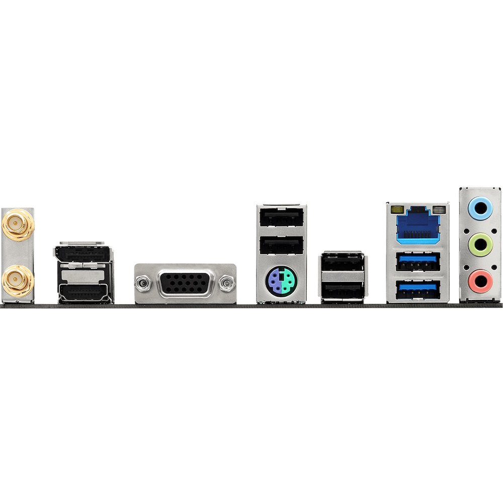 | Rear Panel I/O | 2 x Antenna Ports, 1 x PS/2 Mouse/Keyboard Port, 1 x D-Sub Port, 1 x HDMI Port, 1 x DisplayPort 1.4, 2 x USB 3.2 Gen1 Ports, 4 x USB 2.0 Ports, 1 x RJ-45 LAN Port, HD Audio Jacks: Line in / Front Speaker / Microphone |