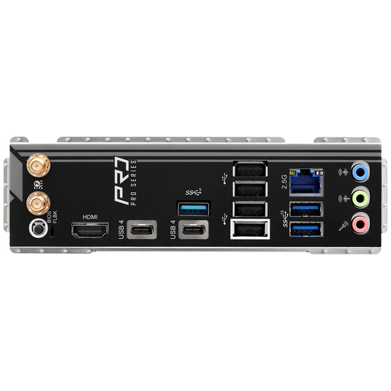 | Interface | 2 x antenne | 1 x HDMI | 2 x USB4 | 2 x USB 3.2 Gen 2 | 1 x USB 3.2 Gen 1 | 4 x USB 2.0 | 1 x LAN (2.5Gigabit Ethernet) | 1 x audio linje-ud - mini-jack | 1 x mikrofon - mini-jack | 1 x audio linje-ind - mini-jack |