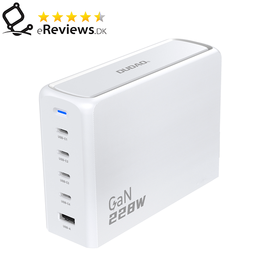 "Dudao A228EU er en kraftig oplader, men dog ikke så kraftig som specifikationerne indikerer. I min test kunne den lade med maksimalt ca 75 watt på et enkelt USB-C stik der var specificeret til 100 watt. Dog er det også rigeligt til mange enheder og laptops. Og så har man hele 4 USB-C og et USB-A stik til rådighed hvis man skal oplade mange enheder samtidigt."