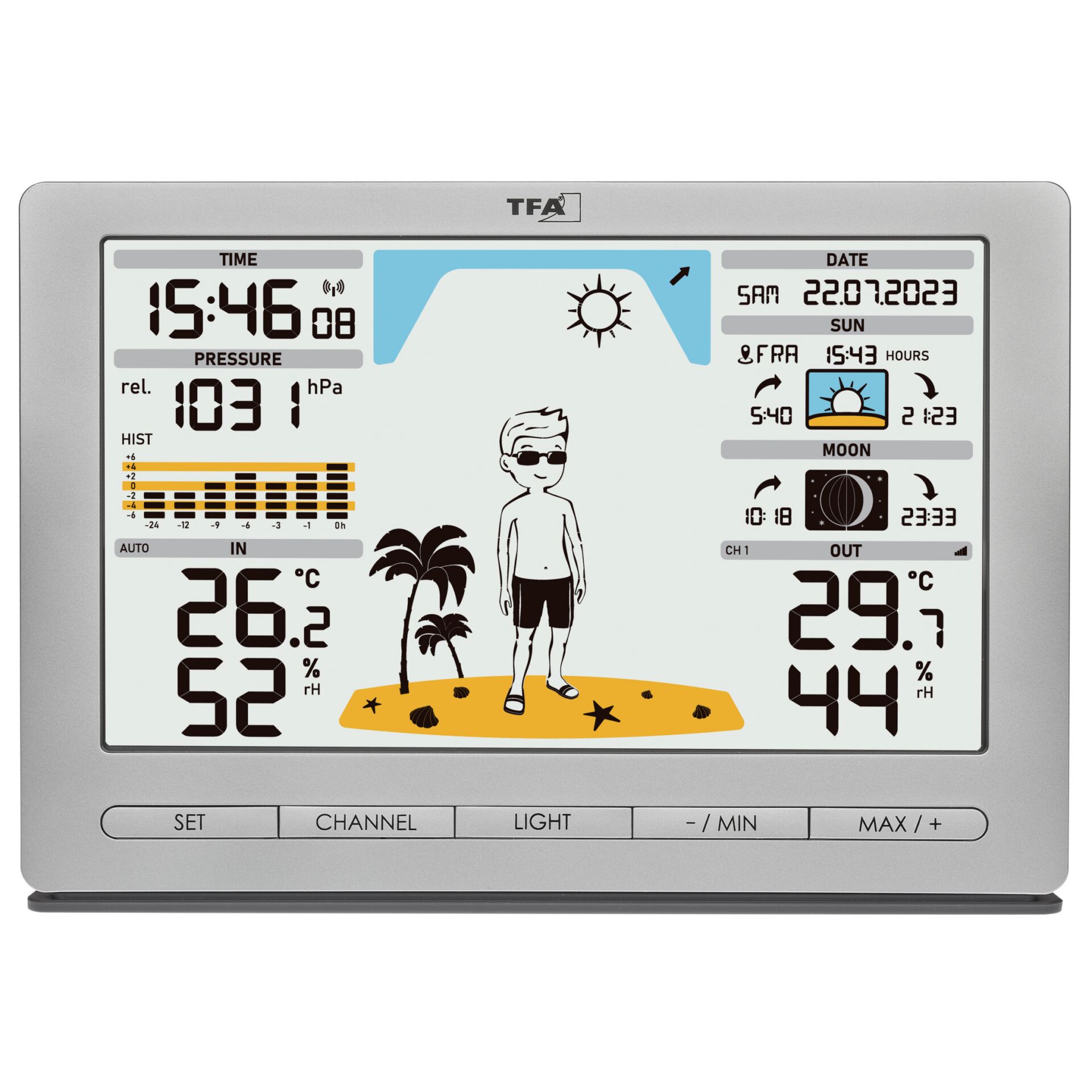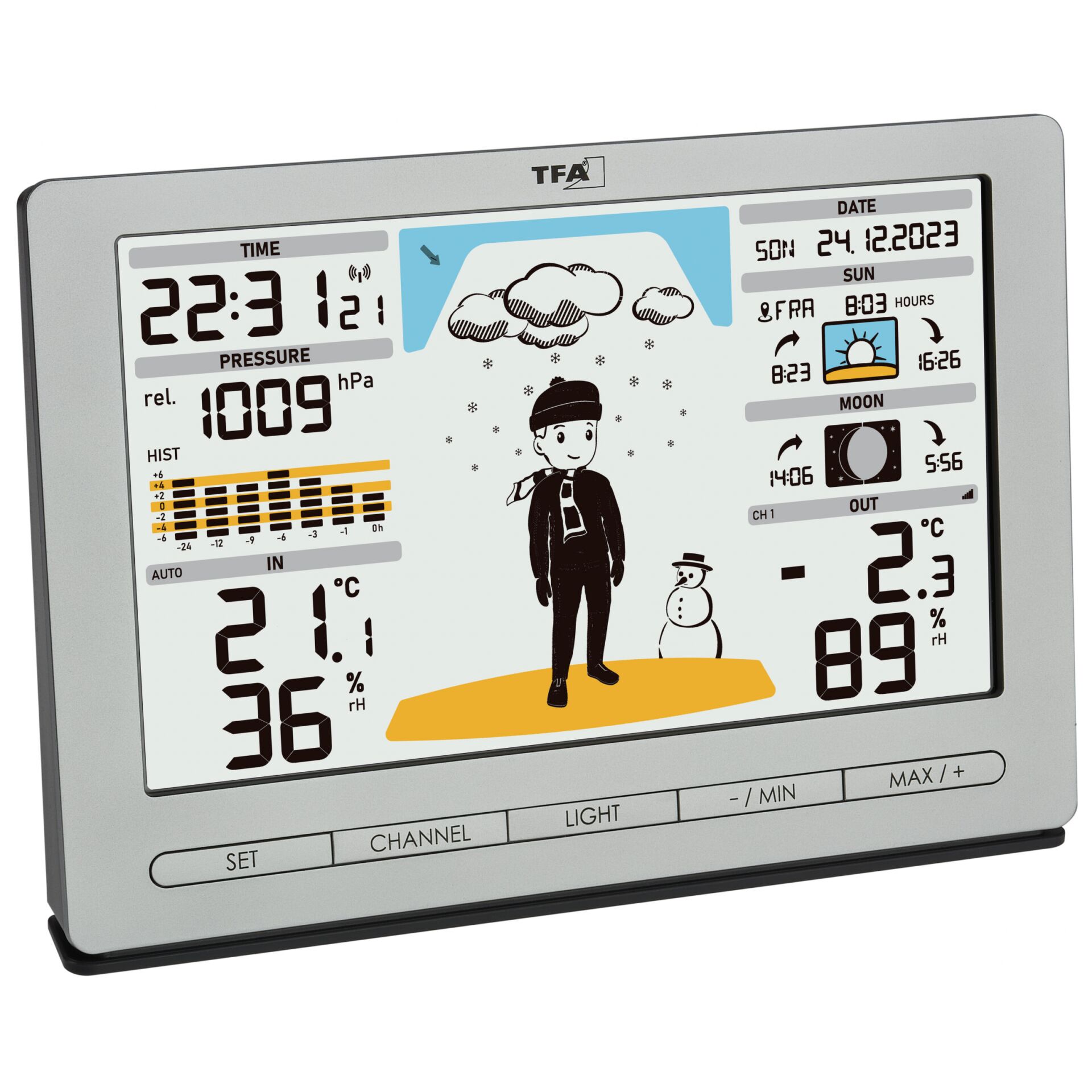 | Trend visning af målefunktioner | Barometer, Hygrometer, Termometer |
