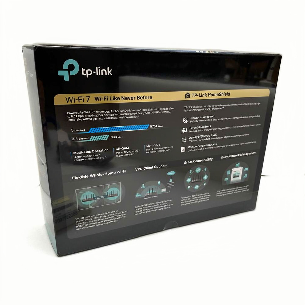 TP-Link Archer BE400 V1 er en alsidig trådløs router, der er designet til at levere ydeevne på tværs af flere enheder. Med en dataoverførselshastighed på op til 6,5 Gbps håndterer den problemfrit krævende aktiviteter som streaming, spil og browsing, hvilket sikrer problemfri forbindelse i hele hjemmet eller på kontoret.