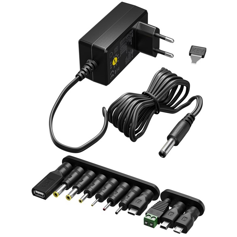 | Adapters | DC adapters: 5.5 x 2.5 mm, 2.5 x 0.7 mm, 3.0 x 1.1 mm, 3.5 x 1.35 mm, 4.0 x 1.7 mm, 4.8 x 1.7 mm, Micro-USB, Mini-USB, USB-C, USB-A socket, Screw terminal |