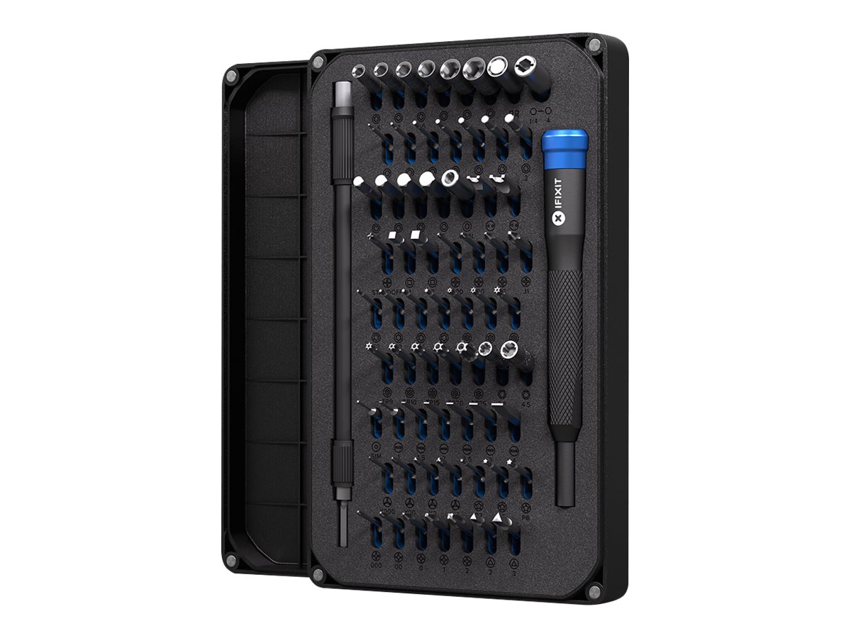 | Pakkeindhold | 6 åbningshakker, antistatisk håndledsrem, metal-spudger, hellebard-spudger, spudger, håndtag til skruetrækker, Jimmy-åbningsværktøj, fleksibelt forlængerskaft, omvendt pincet, bøjet pincet, stump pincet, 3 åbningsværktøjer, sugekop, 5 skruetrækkerbit - stjerne PH000, PH00, PH0, PH1, PH2, 6 skruetrækkerbits - slot 1, 1,5, 2, 2,5, 3, 4 mm, 4 skruetrækkerbits - torx T2, T3, T4, T5, 8 skruetrækkerbits - manipulationssikker torx T6, T7, T8, T9, T10, T15, T20, T25, 3 skruetrækkerbits - pentalobe P2. P |