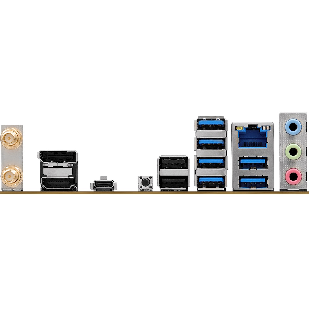 | Rear Panel I/O | 2x Antenna Ports, 1x HDMI Port, 1x DisplayPort 1.4, 1x USB 3.2 Gen2x2 Type-C Port (20 Gb/s), 6x USB 3.2 Gen1 Ports, 2x USB 2.0 Ports, 1x RJ-45 LAN Port, 1x BIOS Flashback Button, HD Audio Jacks: Line in / Front Speaker / Microphone |