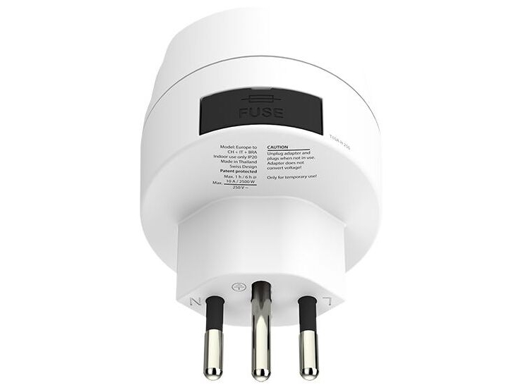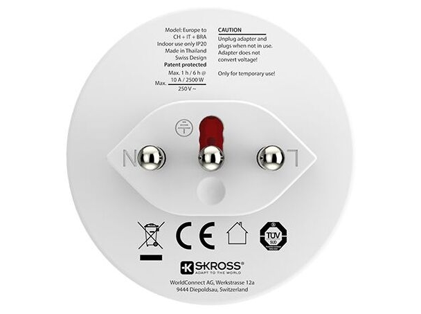 SKROSS Country Adapter Europe til Schweiz, Italien og Brasilien - Stikadapter - Type C/E/F til Type J/L/N - 100-250 V - 10 A - hvid