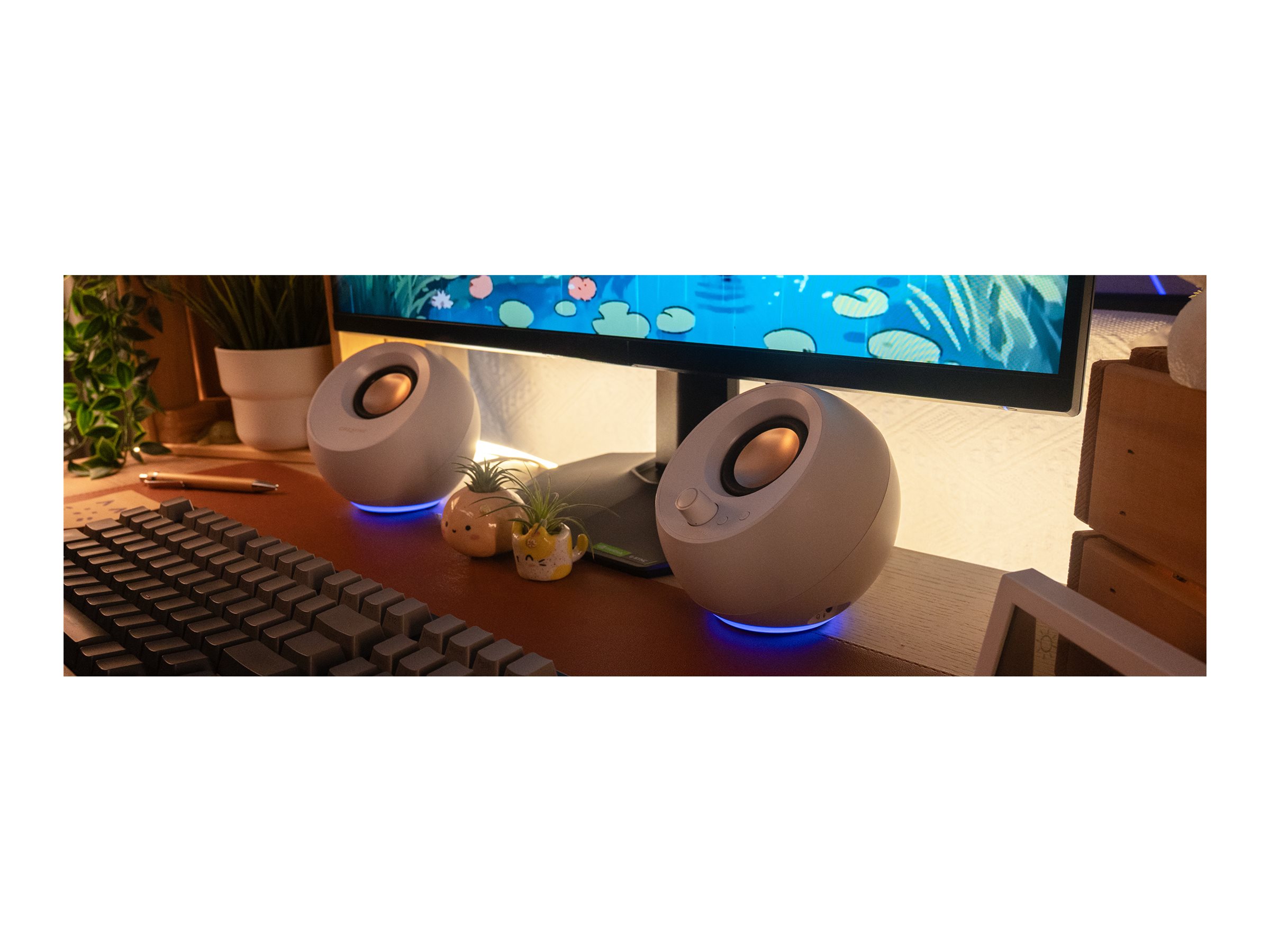 Creative Pebble Pro-højttalere er designet til en fordybende lydoplevelse, der er skræddersyet til pc-brugere. Disse kompakte højttalere har et vinklet design, der forbedrer lydprojektionen og tilføjer et moderne touch til ethvert arbejdsområde. De er udstyret med RGB-belysning, der kan tilføje et farvestænk, der synkroniseres med dit miljø og din stemning.
