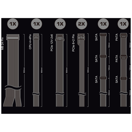 | Output-stikforbindelser | 1 x strøm 24 pin ATX | 1 x strøm 8 pin EPS12 V med aftagelig 4 pin ATX12V sektion | 2 x 8 pin PCI Express-strøm med aftagelig 2 pin sektion | 4 x 15 pin Serial ATA strøm | 2 x 4-PIN intern strøm | 1 x 12VHPWR |