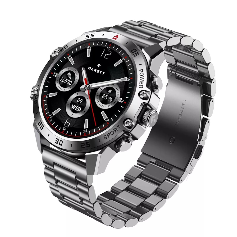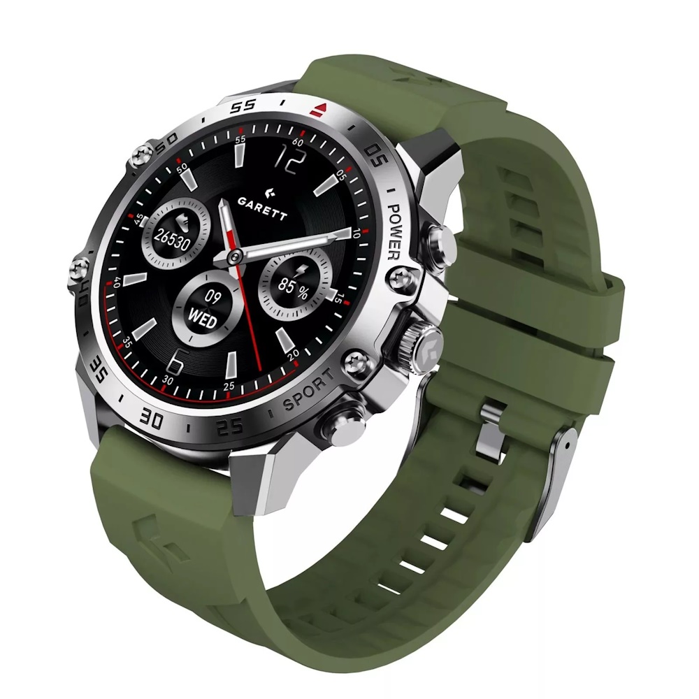 Garett V14 - Set med ekstra rem - 47 mm - rustfrit stål - smart ur med rem - sølv/grøn - håndledsstørrelse: 155 - 235 mm - display 1.43" - Bluetooth - 115 g - Solidt Stål