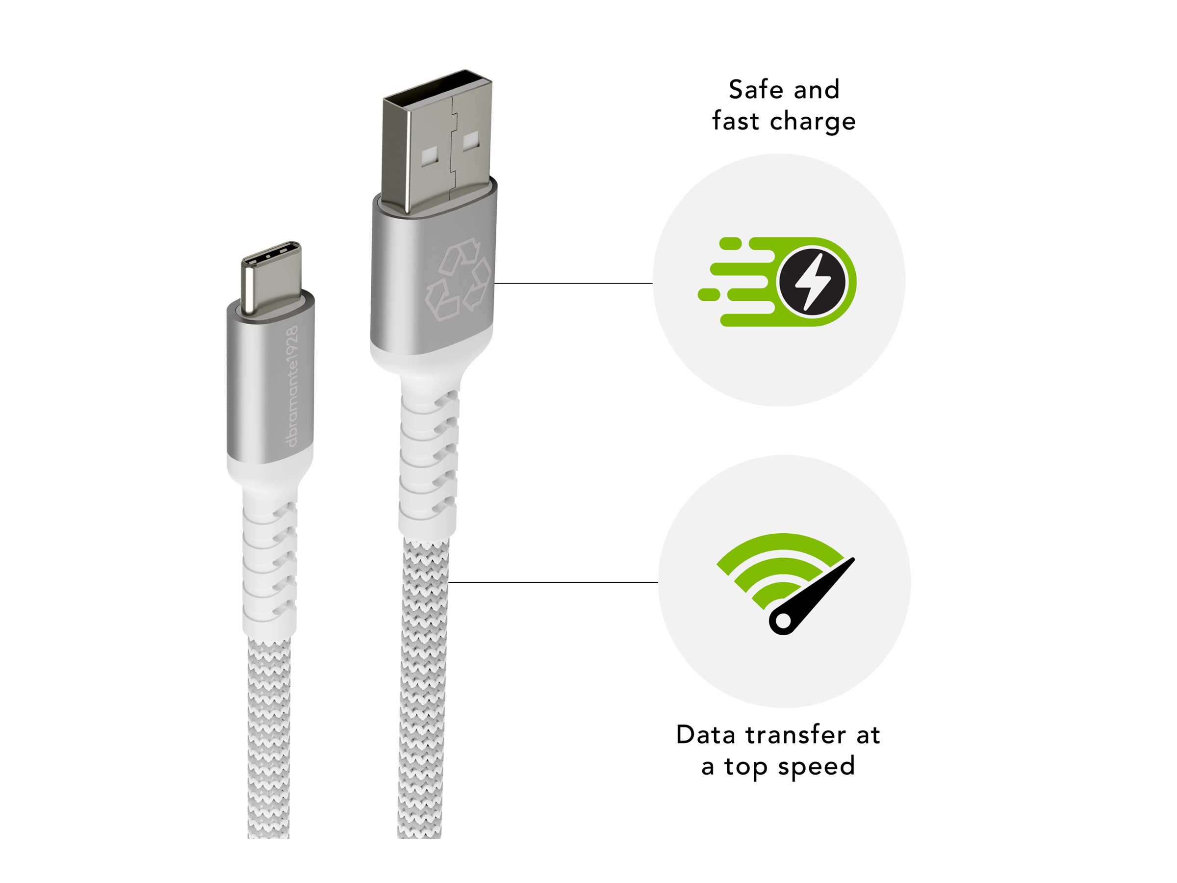 | Egenskaber | Op til 36 W strømtransfer, braided cable, 100 % genbrugt plastik, synkronisering og opladning, Quick Charge, 480 Mbps datahastighed, 10000+ bøjninger levetid |
