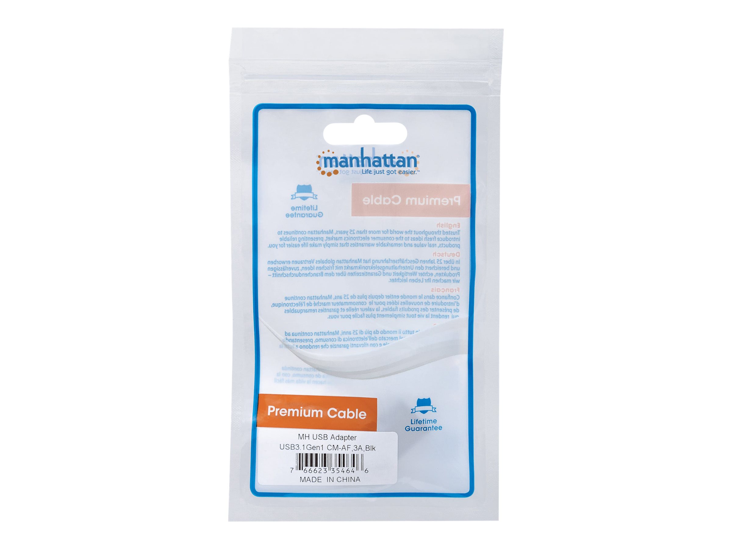 Manhattan USB-C to USB-A Adapter, Male to Female, 5 Gbps (USB 3.2 Gen1 aka USB 3.0), SuperSpeed USB, Black, Lifetime Warranty, Polybag - USB adapter - USB-C (han) til USB Type A (hun) - USB 3.1 Gen1 - 3 A - formet - sort
