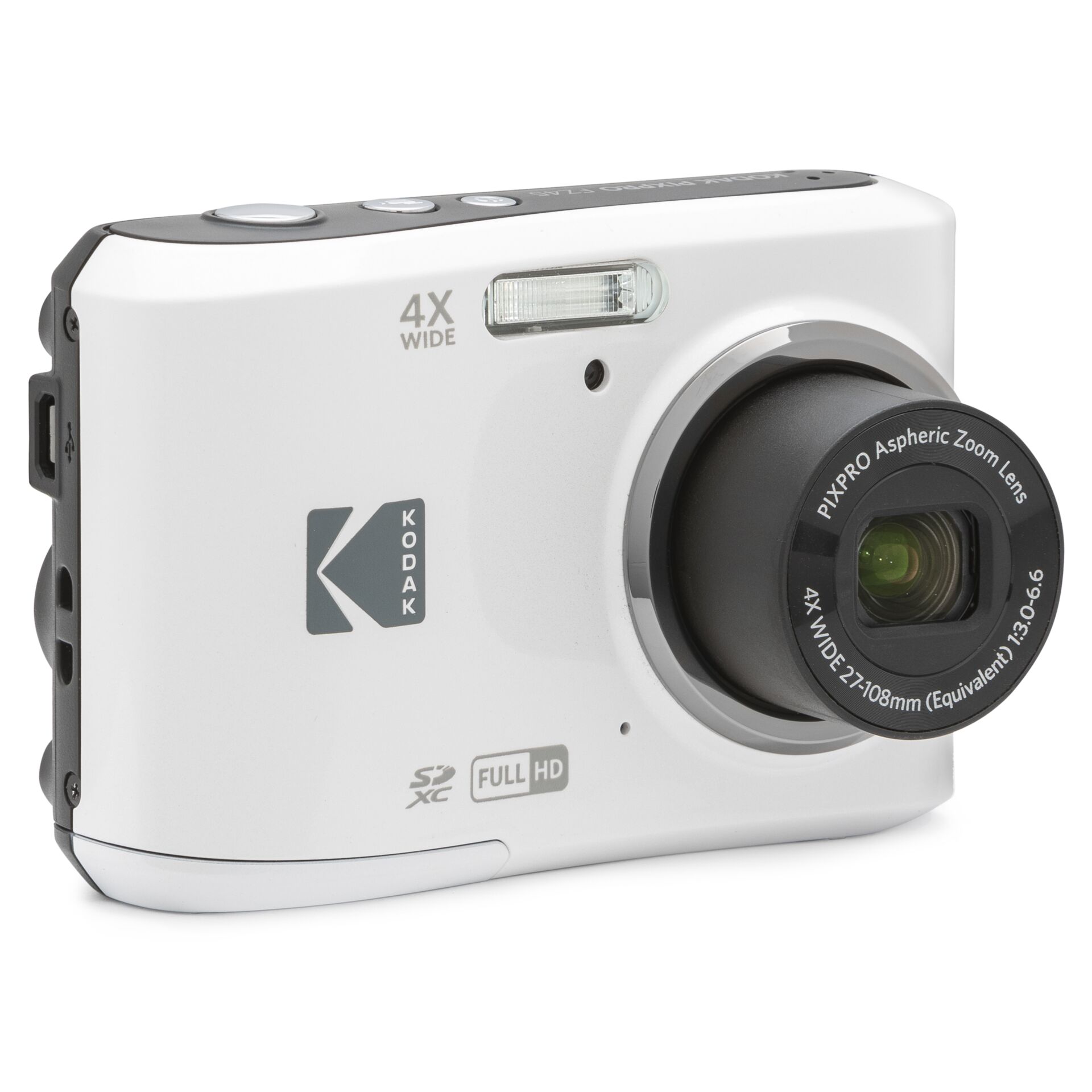 Kodak PIXPRO FZ45. Kameratype: Kompakt kamera, Megapixel: 16 MP, Billede sensor størrelse: 1/2.3", Sensortype: CMOS, Maksimal billedopløsning: 4608 x 3456 pixel. ISO-følsomhed (maks.): 3200. Optisk zoom: 4x, Digital zoom: 6x, Brændviddeområde: 4.9 - 19.6 mm. HD-type: Fuld HD, Maksimal videoopløsning: 1920 x 1080 pixel. Skærm diagonal: 6,86 cm (2.7"). Intern hukommelse: 63 MB. Vægt: 117 g. Produktfarve: Hvid