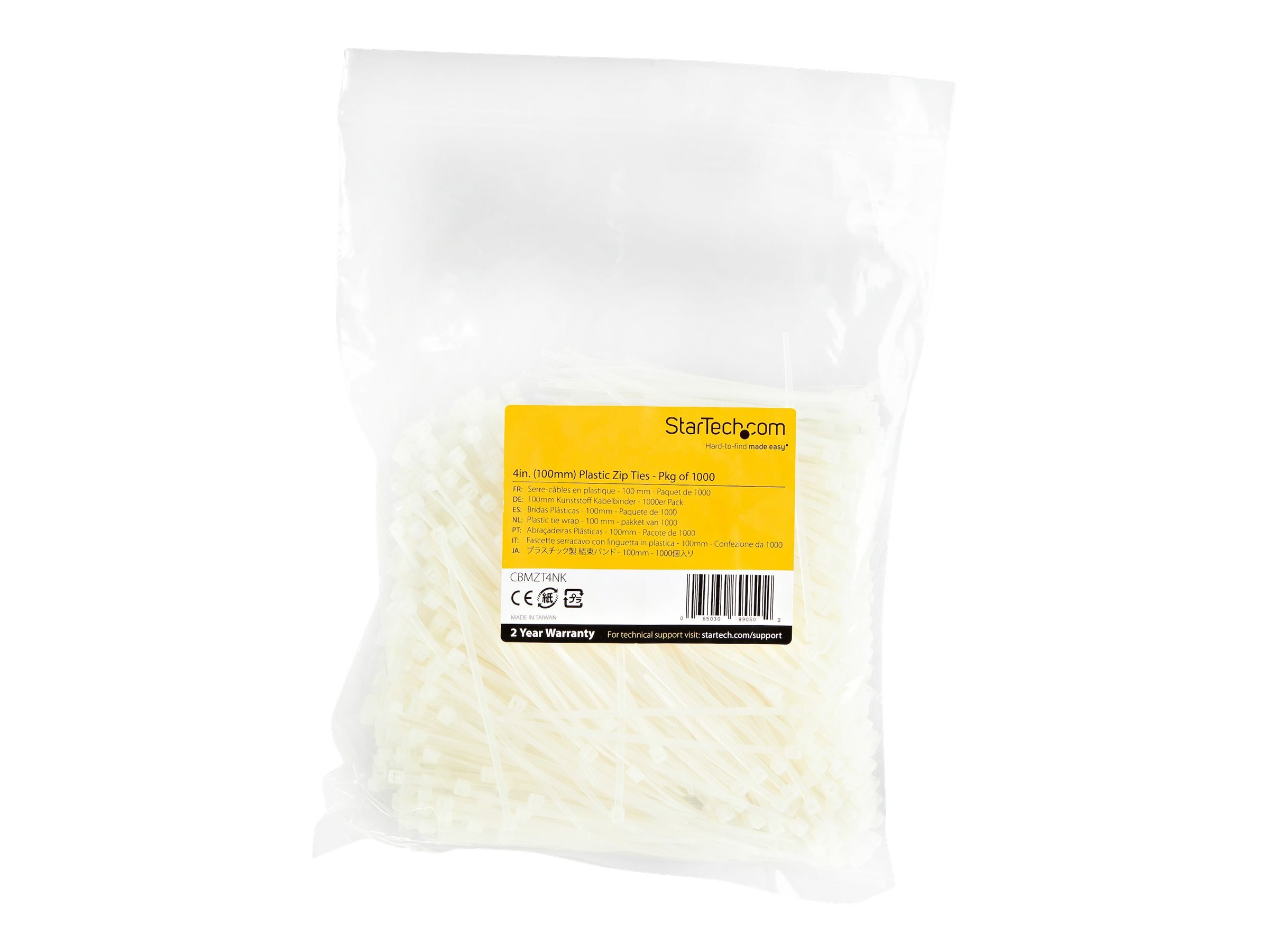 | Produktbeskrivelse | Startech 10cm(4") Cable Ties, 2mm(1/16") wide, 22mm(7/8") Bundle Diameter, 8kg(18lb) Tensile Strength, Nylon Self Locking Zip Ties with Curved Tip, 94V-2/UL Listed, 1000 Pack, White - Nylon 66 Plastic - TAA (CBMZT4NK) - kabelbånd - TAA-kompatibel |