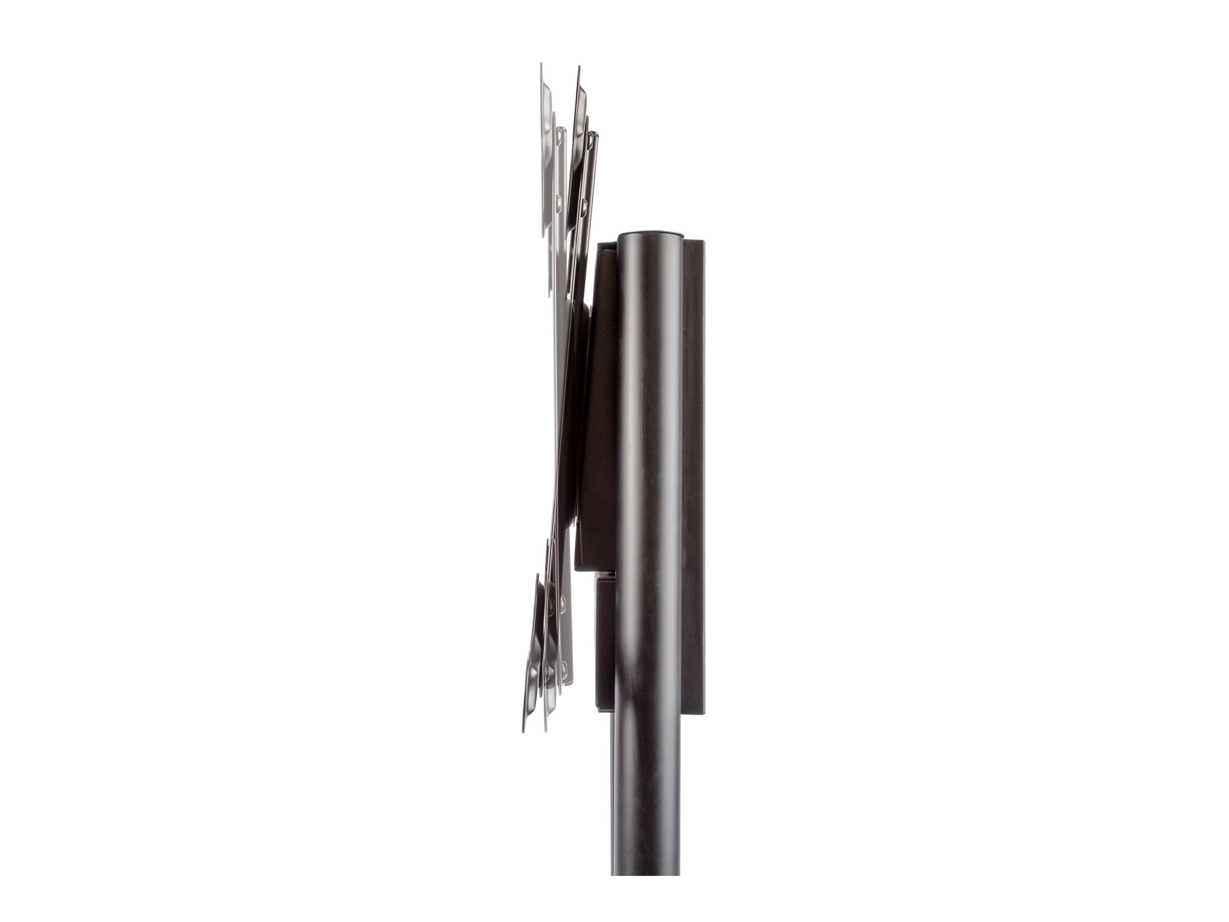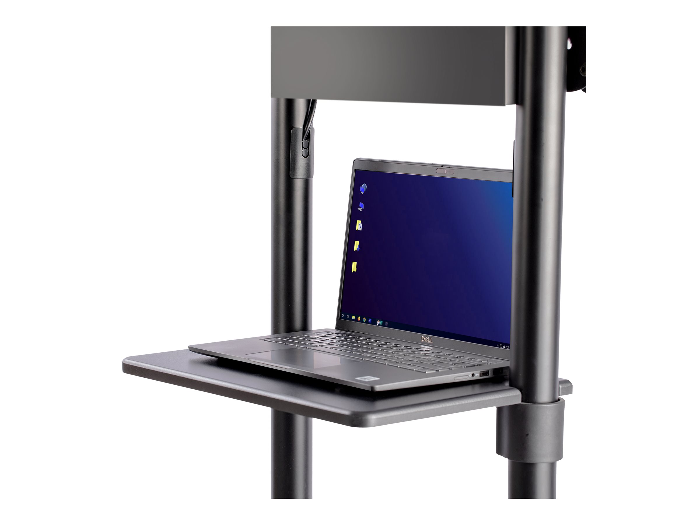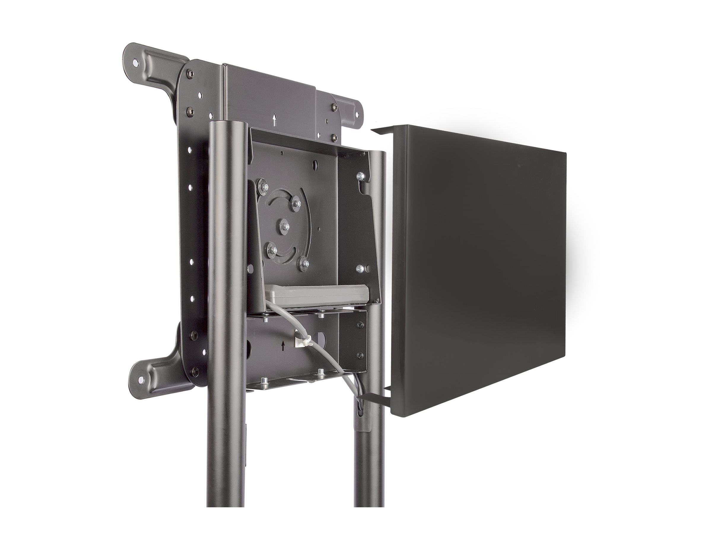 For increased portability, this universal mobile cart offers a device shelf for equipment that needs to be easily accessible and supports up to 11 lb/5 kg, and a storage compartment behind the TV ideal for storing equipment like power bars, or media players. To avoid interference with larger displays in portrait mode, the equipment shelf protrudes out from the back.