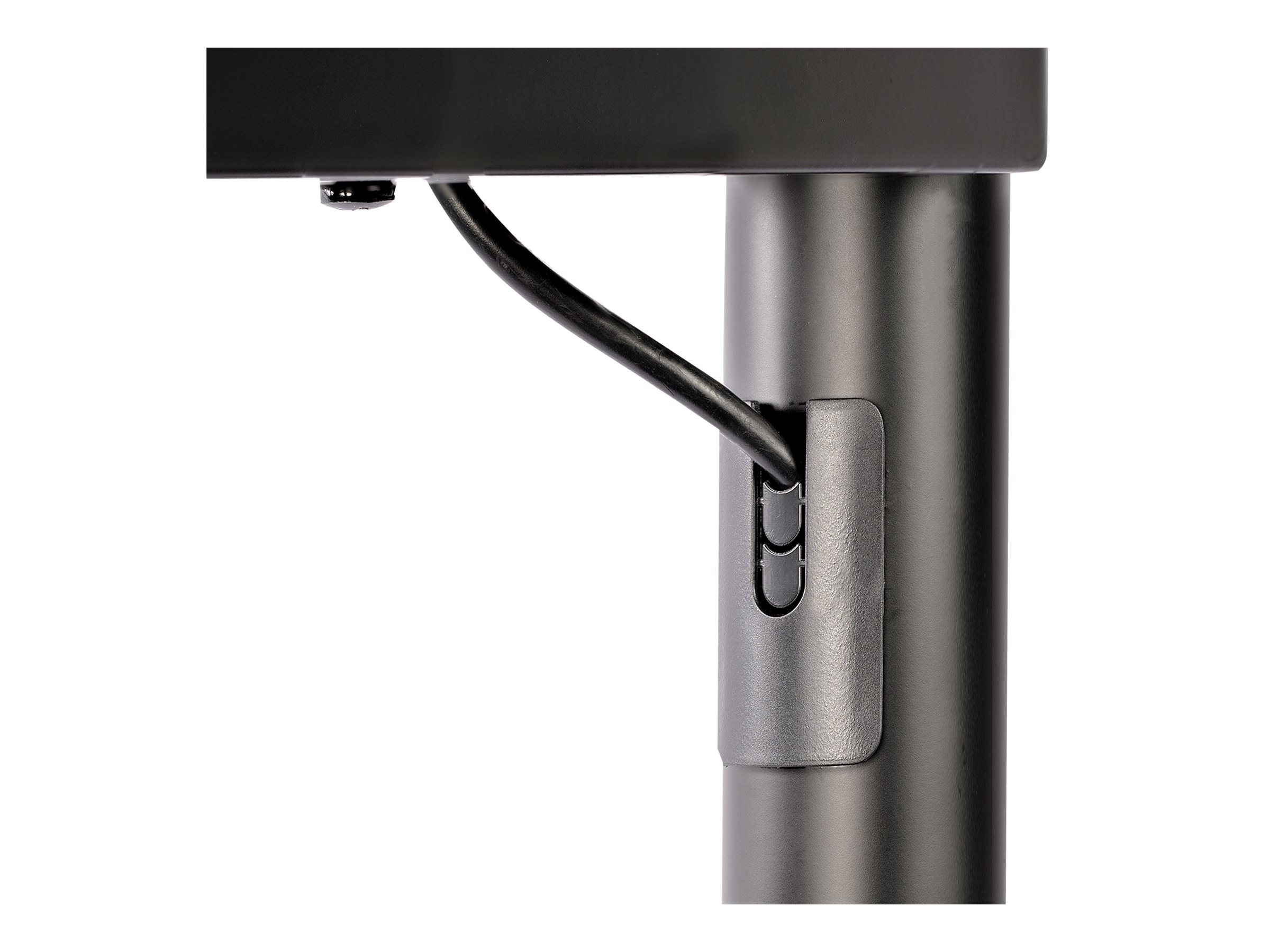 The heavy-duty TV stand's durable construction makes it ideal for commercial use, in environments with multiple users and frequent movement between areas. Additionally, it is equipped with 4 polyurethane casters which are lockable using a pedal and will provide smooth movement across different types of floors/carpet, while avoiding drag marks on surfaces. Built-in cable management keeps your cables organized and hidden from view; cables are run through the columns with entry points below the storage compartment.