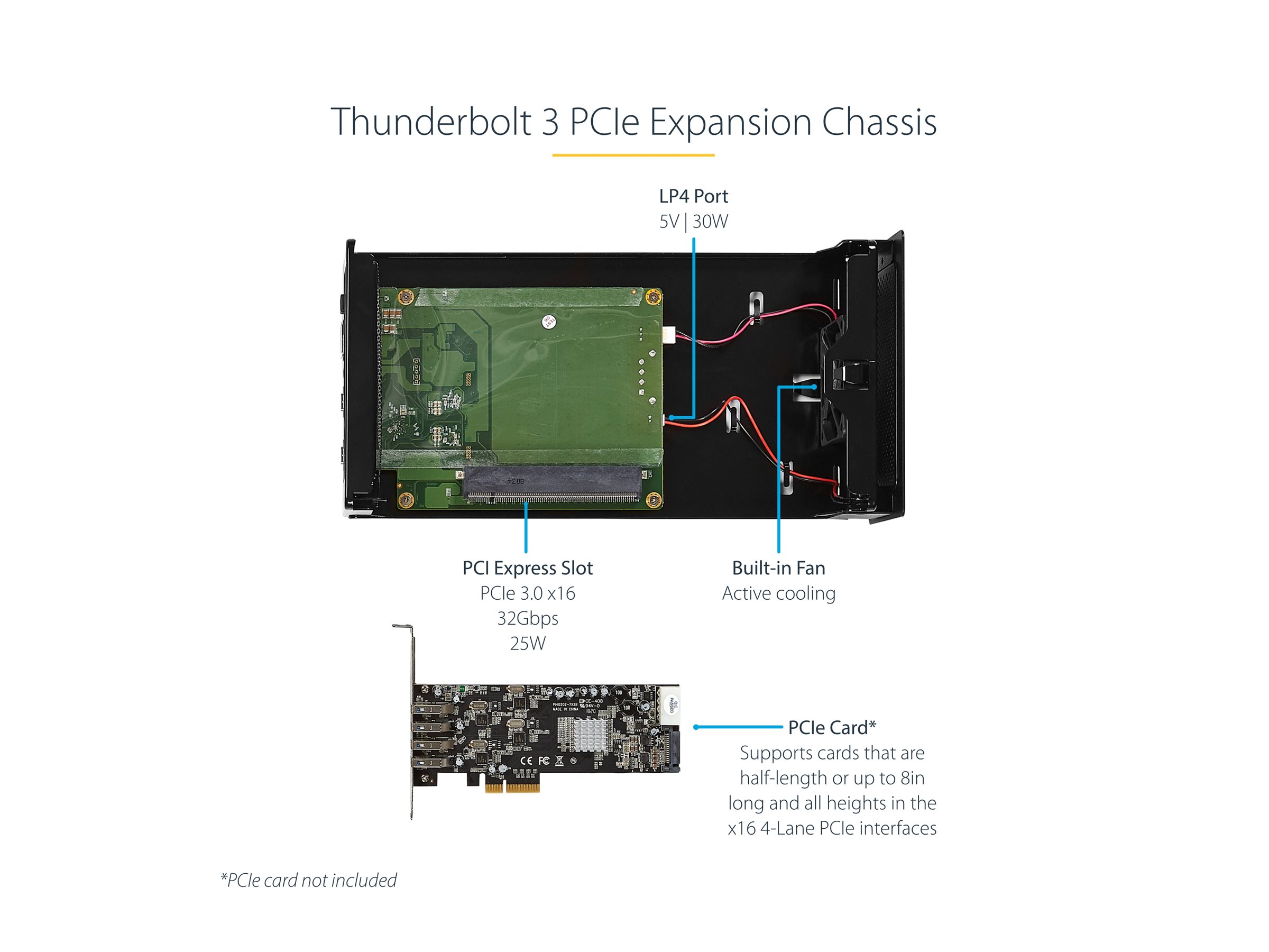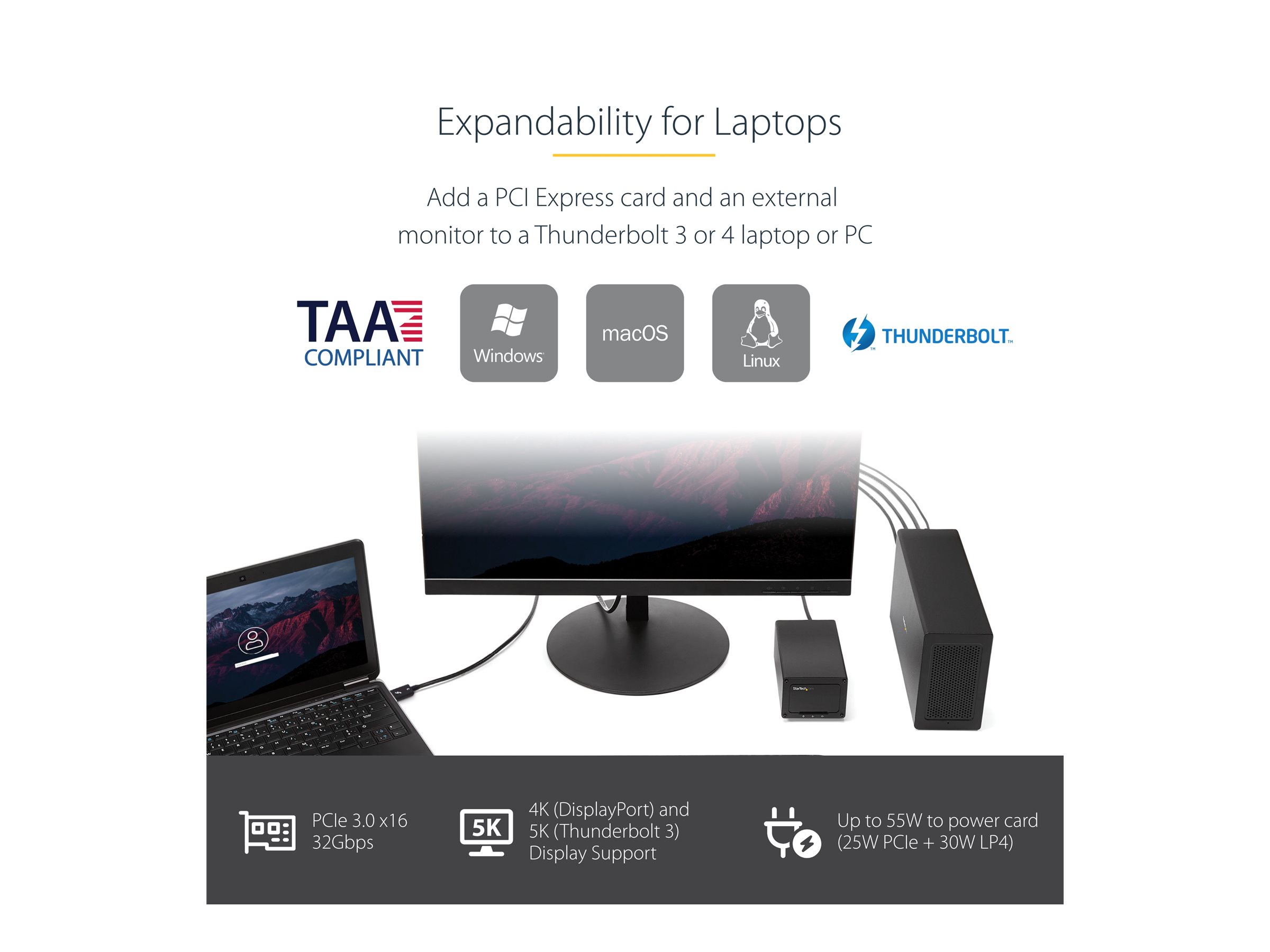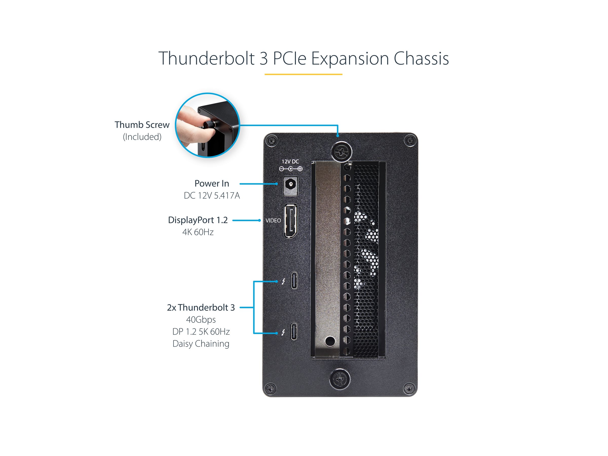 | Produktbeskrivelse | Startech Thunderbolt 3 PCIe Expansion Chassis, External Enclosure Box with 1x PCI-Express Slot, 5K/4K Output Via TB3/DP Ports, TAA - busudvidelse til system - DP |