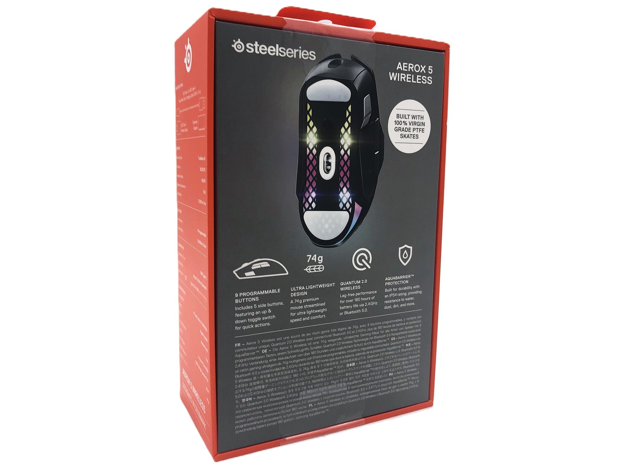 | Egenskaber | Scrollhjul, polytetrafluoroethylene (PTFE) feet, 9 programbare knapper, 16,8 million multifarvet oplysning, Zero Hardware Acceleration, aftageligt kabel, 3 RGB-zoner, AquaBarrier Protection, SteelSeries TrueMove Air sensor, Quantum 2.0 Wireless-teknologi, 80 millioner klik, Holey Shell |