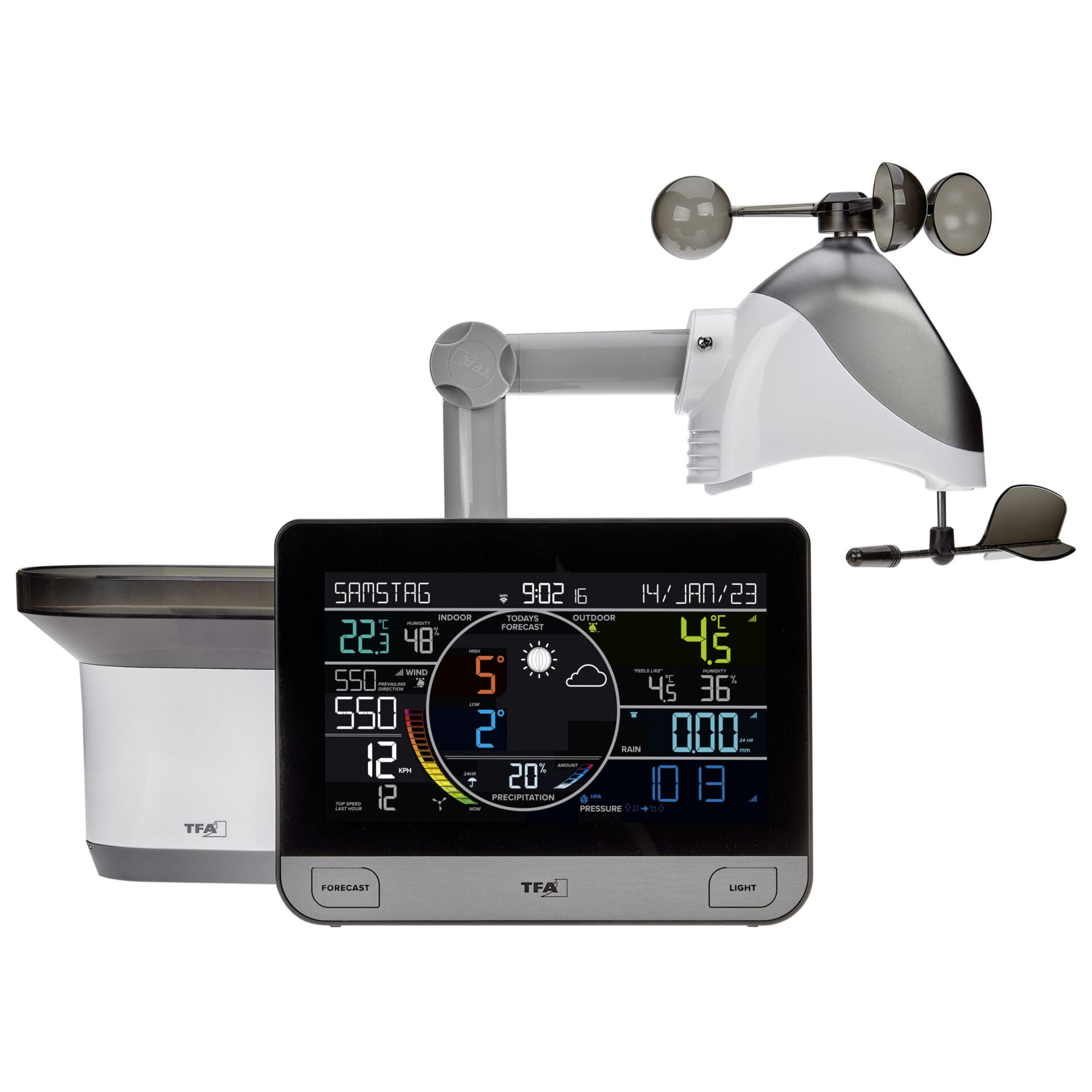 | Målefunktioner | Anemometer (vindhastighed), Indendørs hygrometer, Indendørs termometer, Udendørs barometer, Udendørs hygrometer, Udendørs termometer, Nedbør |