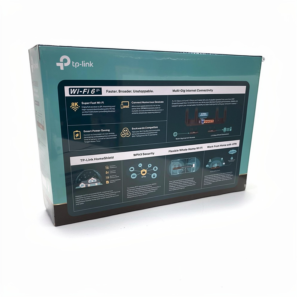 Egenskaber NAT-understøtning, VPN support, SPI, forældrekontrol, ACL support, QoS, WPS, DHCP server, FTP server, port fremsendelse, UPnP Media Server, nulstillingsknap, port triggering, dynamisk IP modus, DHCP klient, strømsparetilstand, stråleformeteknologi, Smart Connect, Airtime Fairness, DMZ-support, OpenVPN-klient, OpenVPN server, 8K HD video streaming, OneMesh support, Guest Network, TP-Link HomeShield