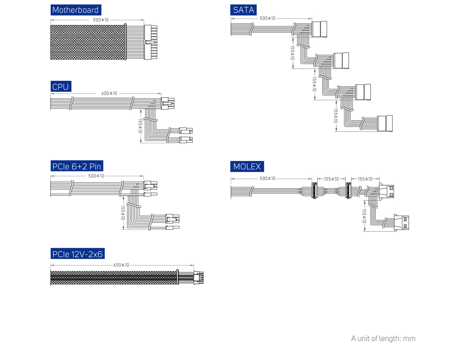| Stik | 1x 24 Pin Bundkort - 1x 2 CPU 8/4+4 Pin - 2x 2 PCIe 6+2 PIN - 1x PCIe 12V-2x6 - 1x 4 SATA - 1x 2 MOLEX + 2 SATA |
