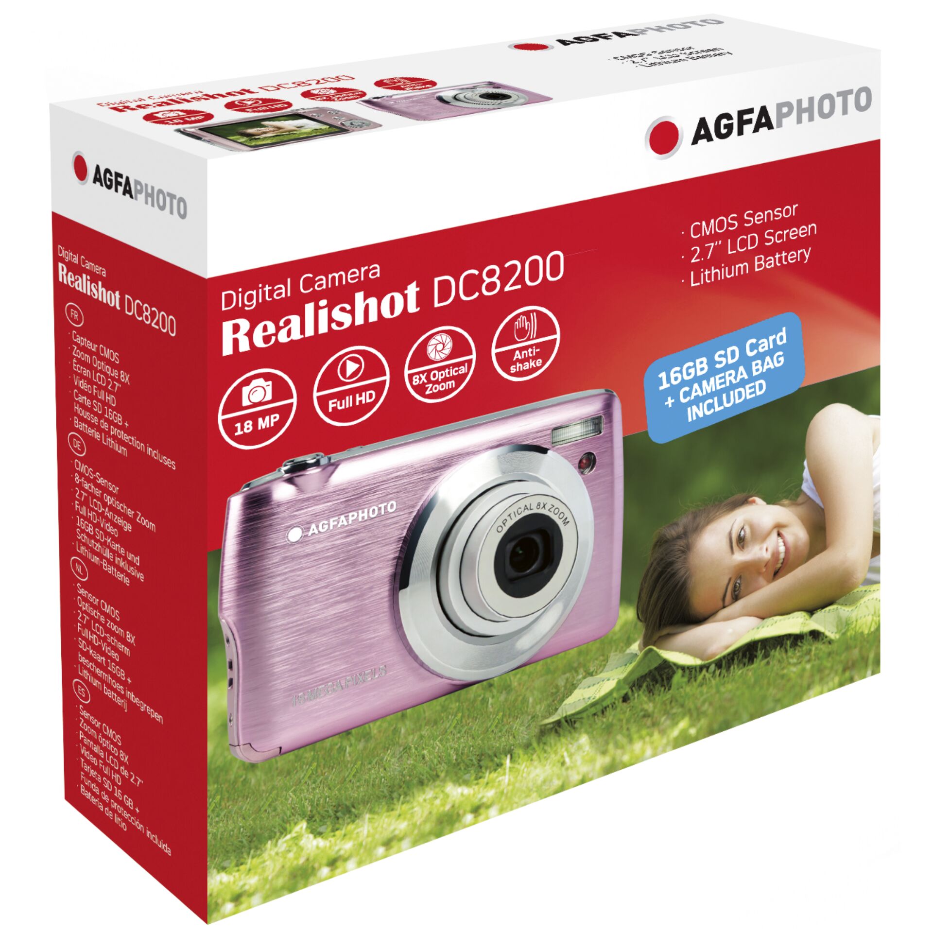 AgfaPhoto Compact Realishot DC8200. Kameratype: Kompakt kamera, Megapixel: 18 MP, Billede sensor størrelse: 1/3.2", Sensortype: CMOS, Maksimal billedopløsning: 4896 x 3672 pixel. Optisk zoom: 8x. HD-type: Fuld HD, Maksimal videoopløsning: 1920 x 1080 pixel. Skærm diagonal: 6,86 cm (2.7"). Produktfarve: Lyserød