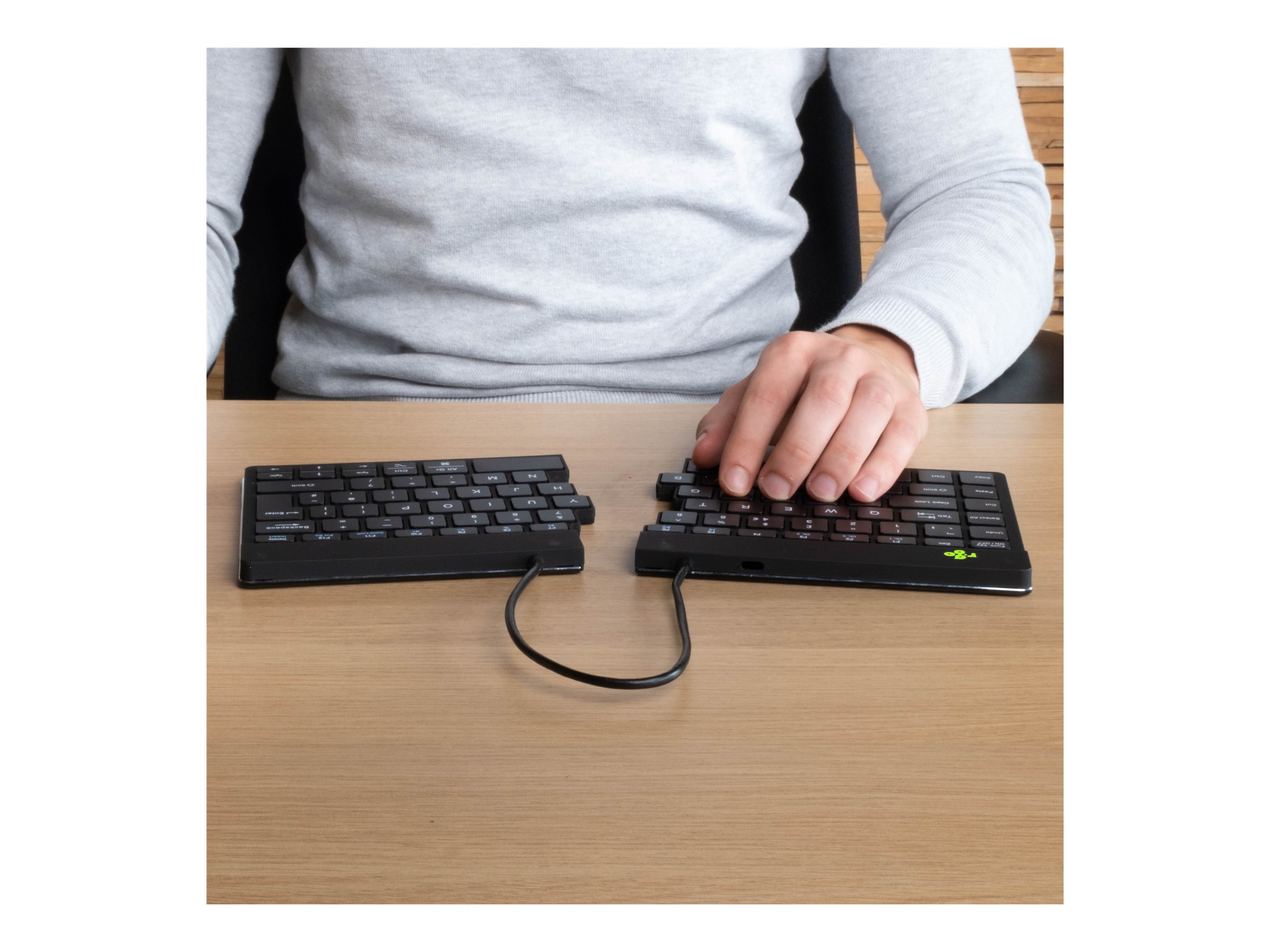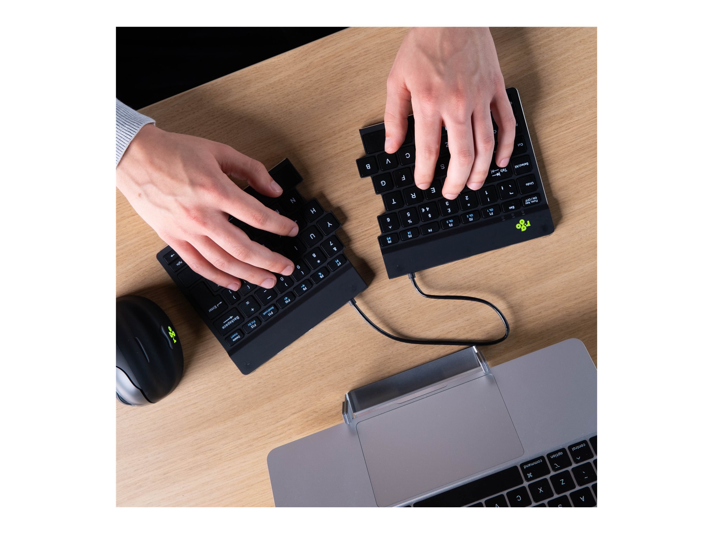 Dette tastatur er designet med et delt ergonomisk design, der fremmer en mere naturlig hånd-, håndleds- og underarmsposition for komfortabel skrivning under lange arbejdssessioner.