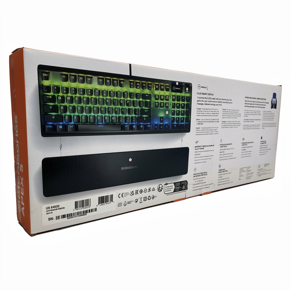 Steelseries Apex 5. Tastatur formfaktor: Fuld størrelse (100 %). Tastatur stil: Lige. Forbindelsesteknologi: Ledningsført, Enhedsgrænseflade: USB, Tastatur nøglekontakt: Mekanisk. Type af baggrundslys: RGB LED, Håndledsstøtte. Anbefalet brug: Spil. Produktfarve: Sort