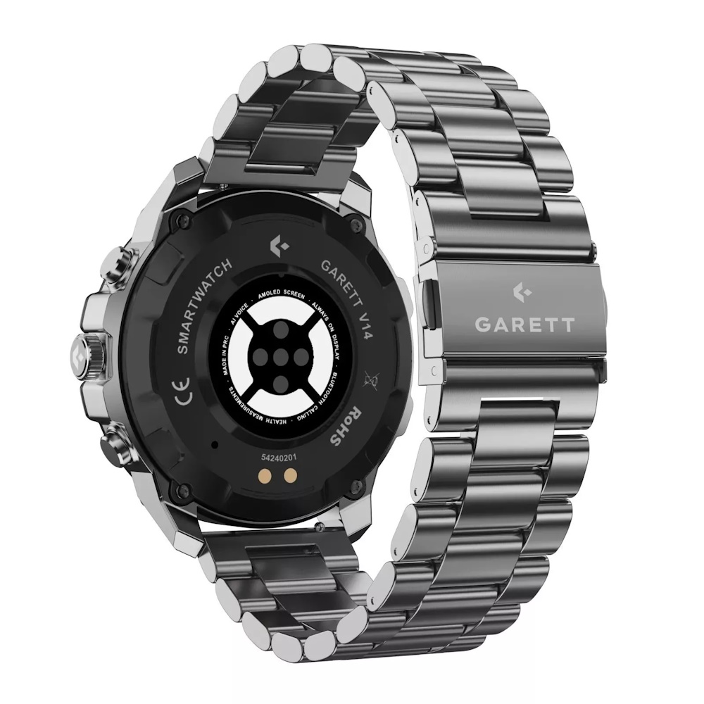 Garett V14 - Set med ekstra rem - 47 mm - rustfrit stål - smart ur med rem - sølv/grøn - håndledsstørrelse: 155 - 235 mm - display 1.43" - Bluetooth - 115 g - Solidt Stål
