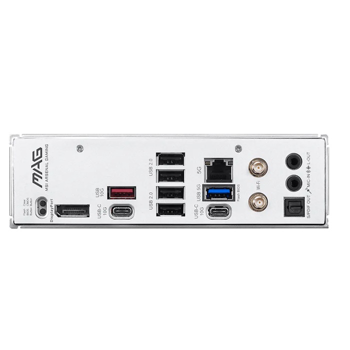 Rear I/O Clear CMOS Button, USB 10Gbps (Type-A), 4x USB 2.0, 5G LAN, Wi-Fi / Bluetooth antenna ports, 1x S/PDIF, 1x Headphone, 1x Microphone, DisplayPort, 2x USB 10Gbps (Type-C), 1x USB 5Gbps (Type-A)